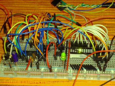 This is how it runs. Here on the picture PIC is behind bigger green LED. It's disconnected from Atmega - Vdd red wire goes straight to rail instead of Atmega leg controlling Vdd. Also behind this red wire is BJT controlling Vpp - programming voltage of +5v of USB and 4.5V of 3xAA. Rightmost is 74HC164 SIPO shift register without latch, wired to led bar. Disregard LM35 thermistor I left here for another ADC probe of ATmega.
